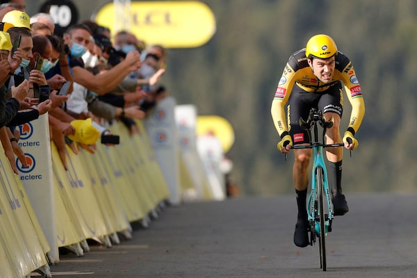 Team Jumbo rider Netherlands' Tom Dumoulin crosses the finish line at the end of the 20th stage of the 107th edition of the Tour de France cycling race on Sept. 19, 2020.CHRISTOPHE ENA/AFP/Getty Images