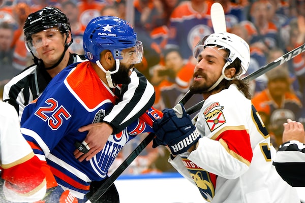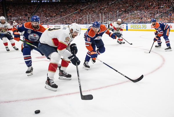 Florida Panthers' Sam Reinhart battles for the puck with Edmonton Oilers' Adam Henrique and Philip Broberg during first period game six.JASON FRANSON/The Canadian Press