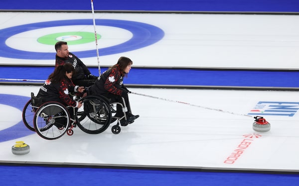 Ina Forrest of Team Canada competes during her wheelchair curling mixed team round robin match against Team Norway on Sunday at the Milan Cortina Winter Paralympics.Maja Hitij/Getty Images