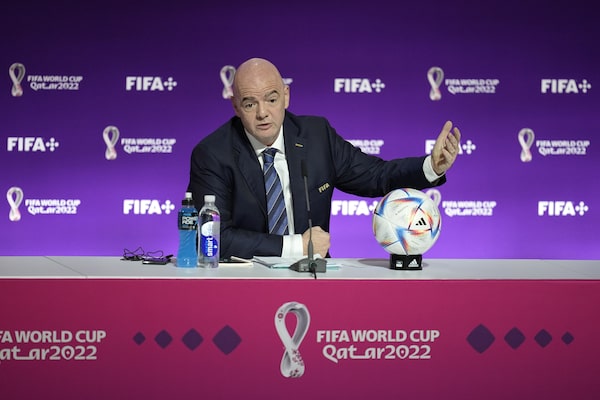 FIFA President Gianni Infantino speaks at a press conference Saturday, Nov. 19, 2022 in Doha, Qatar.Abbie Parr/The Associated Press