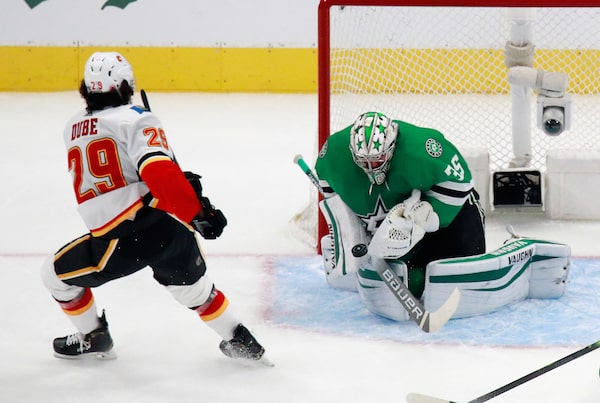 Dillon Dube is stopped by Anton Khudobin of the Dallas Stars in Game One of the Western Conference First Round during the 2020 NHL Stanley Cup Playoffs at Rogers Place on August 11, 2020 in Edmonton.BRUCE BENNETT/Getty Images
