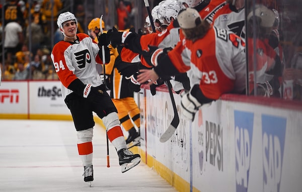 Porter Martone (94) of the Philadelphia Flyers celebrates with teammates on the bench after scoring a goal in Game 1 of their first round playoff series against the Pittsburgh Penguins at PPG PAINTS Arena on Saturday in Pittsburgh.Justin Berl/Getty Images