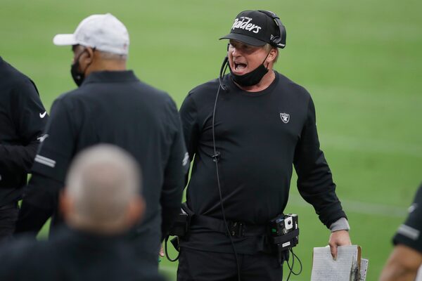 Las Vegas Raiders head coach Jon Gruden speaks on the sideline during the first half of an NFL football game against the Buffalo Bills on Oct. 4, 2020, in Las Vegas.Isaac Brekken/The Associated Press