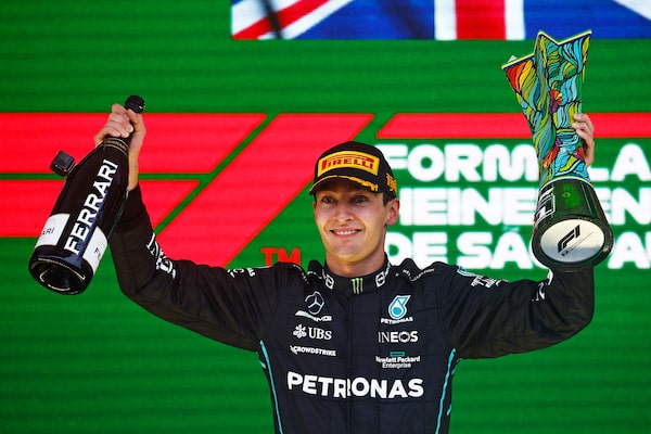 Race winner George Russell of Great Britain and Mercedes celebrates on the podium during the F1 Grand Prix of Brazil at Autodromo Jose Carlos Pace on November 13, 2022 in Sao Paulo, Brazil.Chris Graythen/Getty Images