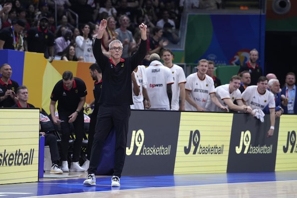 Germany coach Gordie Herbert directs his team during the championship game of the Basketball World Cup against Serbia in Manila, Philippines on Sept. 10.The Associated Press