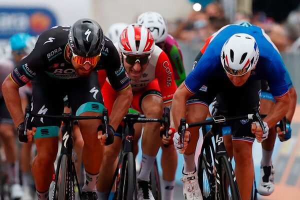 France's Arnaud Demare, right, sprints to cross the finish line ahead of Slovakia's Peter Sagan, left, during the fourth stage of the Giro d'Italia in Villafranca Tirrena, Italy, on Oct. 6, 2020.LUCA BETTINI/AFP/Getty Images