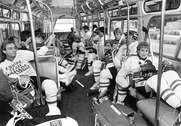 Team Canada's Guy Lafleur (left) and Wayne Gretzky (right) ride the bus with teammates to practice during the Canada Cup series in Montreal on Sept. 10, 1981.Peter Bregg/The Canadian Press