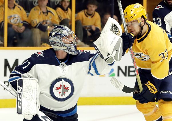 Winnipeg Jets goalie Connor Hellebuyck catches the puck in front of Nashville Predators left wing Viktor Arvidsson on Friday, April 27, 2018, in Nashville, Tenn.Mark Humphrey/The Associated Press