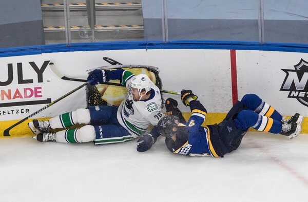 Vancouver Canucks' Tanner Pearson and St. Louis Blues' Carl Gunnarsson crash into the boards during the third period of a first round NHL Stanley Cup playoff hockey series in Edmonton on Aug. 12, 2020. The Canucks beat the Blues 5-2 in Game 1.JASON FRANSON/The Canadian Press
