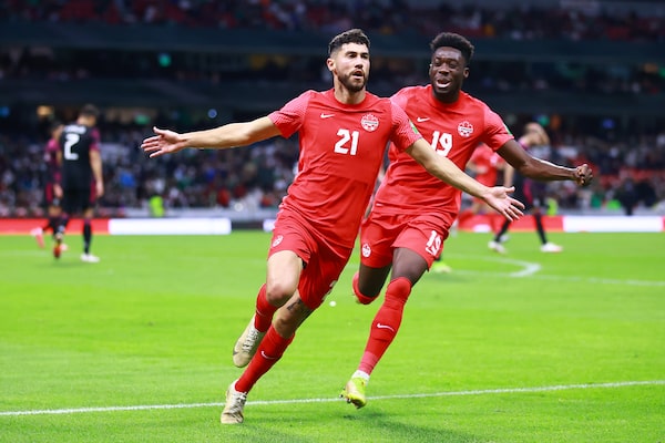 Canada's Jonathan Osorio celebrates with teammate Alphonso Davies after scoring during a qualifying soccer match for the FIFA World Cup Qatar 2022.Fernando Llano/The Associated Press