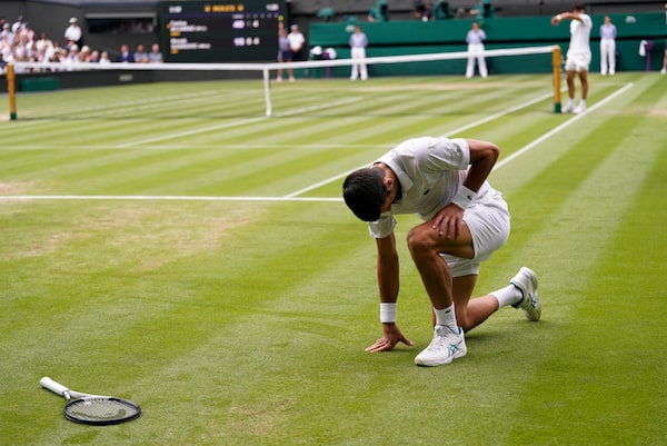 Novak Djokovic gets up after slipping and falling while attempting a return to Carlos Alcaraz in men's singles final at Wimbledon on July 16. Alcaraz beat Djokovic.Alberto Pezzali/The Associated Press