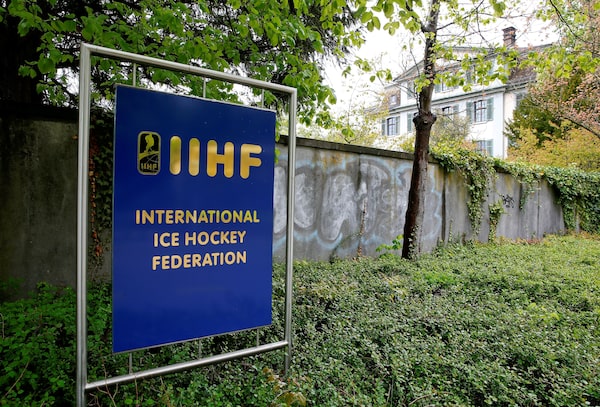 The logo of the International Ice Hockey Federation (IIHF) is seen in front of its seat in Zurich, Switzerland on April 26, 2016.Arnd Wiegmann/Reuters