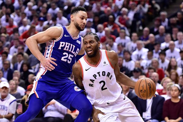 Toronto Raptors forward Kawhi Leonard, right, drives to the net as Philadelphia 76ers guard Ben Simmons defends during second half, second round NBA basketball playoff action in Toronto on April 29, 2019.Frank Gunn/The Canadian Press