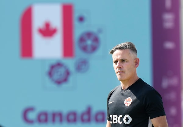 Canada head coach John Herdman watches his team during practice at the World Cup in Doha, Qatar on Nov. 28, 2022. Herdman is stepping down from his role with Canada's national team to become head coach at Toronto FC.Nathan Denette/The Canadian Press