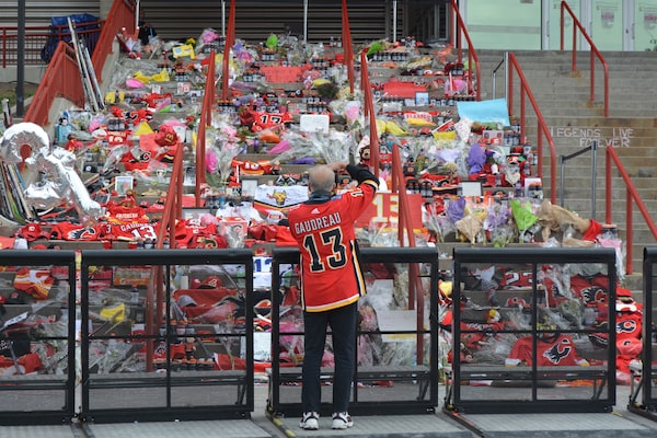 Cecil Whitehead drove more than seven hours from Peace River, Alta., to pay his respects. He placed a black hat with a Flames logo at the base of the memorial underneath a large poster of the fallen brothers, whose photos had been superimposed over clouds.