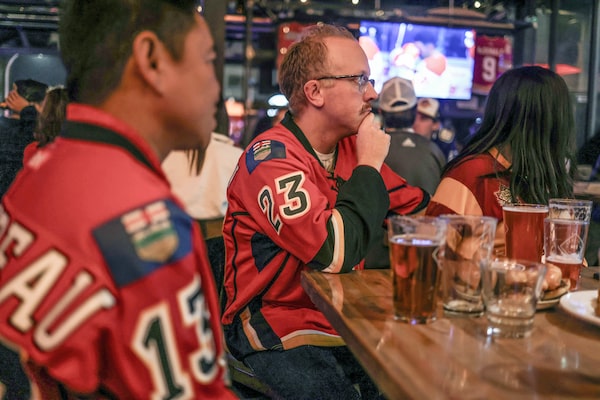 Flames fans Randy Foster, right and Ervin Adem watch a Calgary Flames game at Trolley 5 Brewpub.LEAH HENNEL/The Globe and Mail