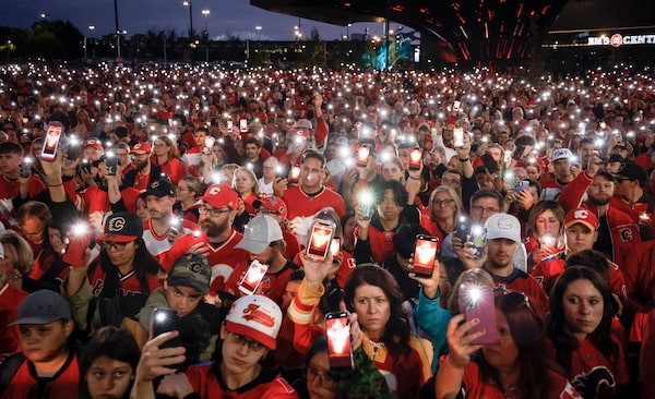 Fans attend a vigil for former Calgary Flames player Johnny Gaudreau and his brother Matthew in Calgary, on Sept. 4.Jeff McIntosh/The Canadian Press