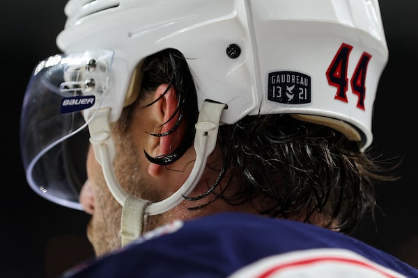 A sticker honoring the lives of Matthew and Johnny Gaudreau is seen on the helmet worn by Columbus Blue Jackets defenseman Erik Gudbranson on Oct. 10.Matt Krohn/Reuters