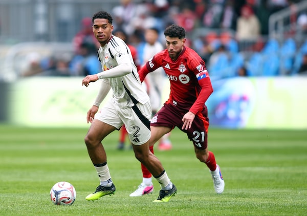 Osorio looks to close down Justin Che of the New York Red Bulls as Toronto FC battled to a 1-1 draw in its home opener at BMO Field last Saturday in Toronto.Vaughn Ridley/Getty Images