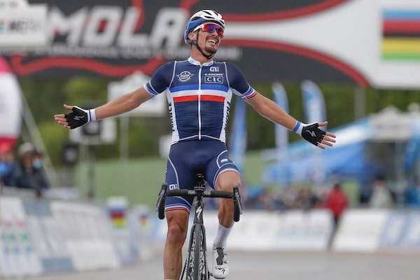 France's Julian Alaphilippe celebrates after winning the men's elite event, at the road cycling World Championships, in Imola, Italy, on Sept. 27, 2020.Andrew Medichini/The Associated Press