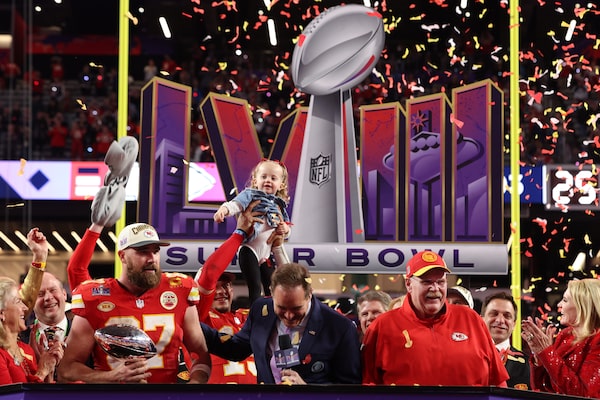 Kansas Chief's Patrick Mahomes lifts his daughter on stage during the Lombardi Trophy presentation after defeating the San Francisco 49ers 25-22 during Super Bowl LVIII at Allegiant Stadium in Las Vegas.Jamie Squire/Getty Images