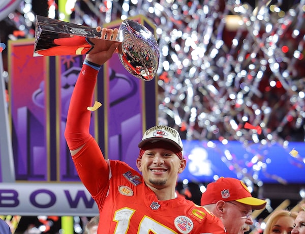 Kansas City Chiefs' Patrick Mahomes celebrates with the Vince Lombardi Trophy after winning Super Bowl LVIII.BRIAN SNYDER/Reuters