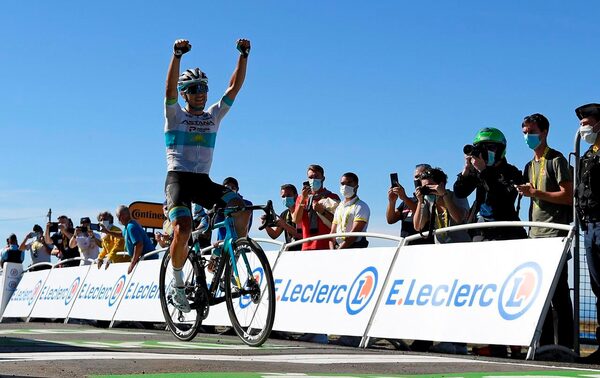 Kazakhstan's Alexey Lutsenko crosses the finish line to win the sixth stage of the Tour de France cycling race over 191 kilometers from Le Teil to Mt. Aigoual on Sept. 3, 2020.The Canadian Press