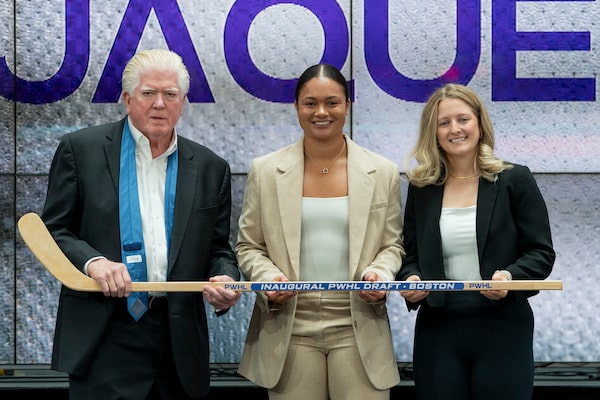 Sophie Jacques, center, from the NCAA, poses with executive director of the Professional Women's Hockey Players Association Brian Burke, left, and Boston general manager Danielle Marmer, right.Spencer Colby/The Associated Press