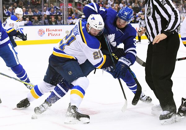 St. Louis Blues center Tyler Bozak (21) battles for a puck with Toronto Maple Leafs center Auston Matthews (34) during the third period at Scotiabank Arena on Oct. 20, 2018.Nick Turchiaro/USA TODAY Sports via Reuters