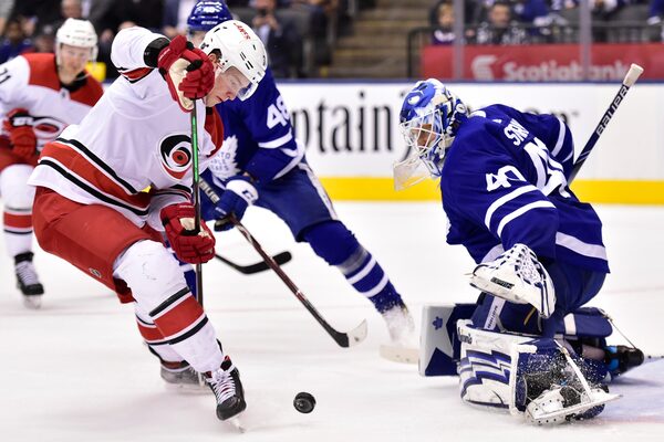 Carolina Hurricanes left wing Warren Foegele (13) tries to control the puck in front of Toronto Maple Leafs goaltender Garret Sparks (40) during third period NHL hockey action in Toronto on April 2, 2019.Frank Gunn/The Canadian Press