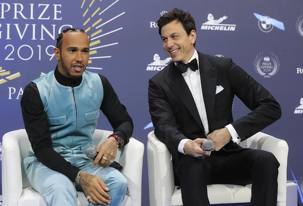 F1 champion Lewis Hamilton and Mercedes team principal Toto Wolff attend the 2019 FIA Champions' Press Conference, in Paris, on Dec. 6, 2019.The Associated Press