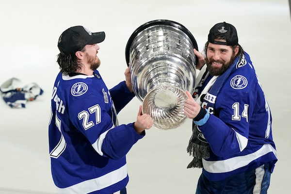 Tampa Bay Lightning defenseman Ryan McDonagh, left, hands the Stanley Cup to left wing Pat Maroon after the 1-0 series win in Game 5 of the NHL hockey Stanley Cup finals against the Montreal Canadiens on July 7, 2021, in Tampa, Fla.Gerry Broome/The Associated Press