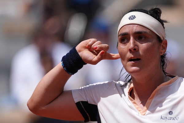 Tunisia's Ons Jabeur gestures during her women's singles quarter final match against Coco Gauff on day ten of the French Open tennis tournament at the Roland Garros Complex in Paris on June 4.DIMITAR DILKOFF/Getty Images