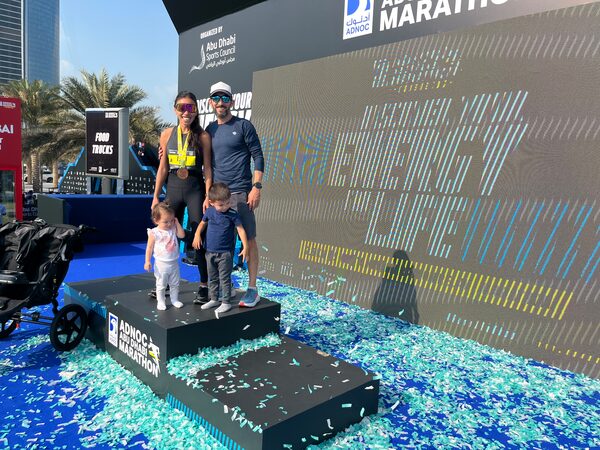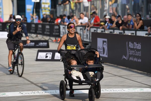 Tifanne Thayme finishes the Adnoc Abu Dhabi Marathon pushing her two children Sasha and Ethan. Behind her on the bike is her husband, Eamon Sallam.Courtesy of Tifanne Thayme
