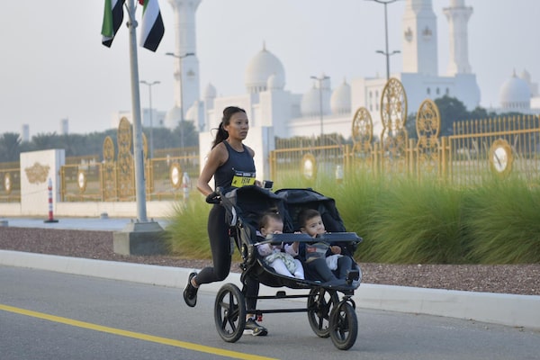 If you watch a brief video of Thayme’s Abu Dhabi run that’s been posted online, you can see the stroller wobbling from side to side because of the difference in her children’s weight. “I have to kind of fight it. I’ve actually had sore wrists from holding the stroller,” she says.