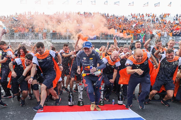 Max Verstappen, centre, celebrates winning the F1 Grand Prix of The Netherlands at Circuit Zandvoort on Sept. 4.Peter Fox/Getty Images