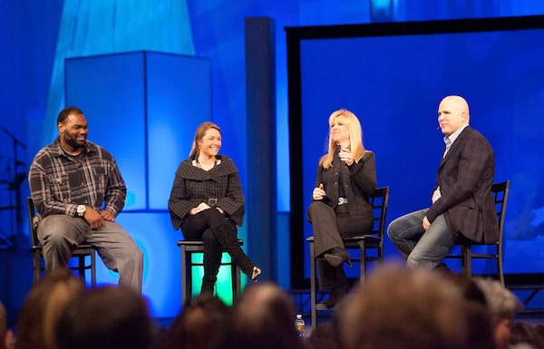 Michael Oher, left, Collins Tuohy, second from left, and Leigh Anne Tuohy, whose lives are portrayed in the Oscar-nominated movie "The Blind Side," speak with Pastor Kerry Shook, right, March 3, 2010 at Woodlands Church's Fellowship Campus.Eric S. Swist/The Associated Press