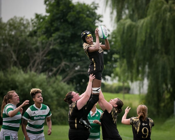 Team co-founder Davine Burton jumps (supported by teammates Rosie Lang, left, and Dallas Hunt, right) to pull in a line-out against the Toronto Saracens near the start of the championship game. Burton plays for the team even though she splits her time between B.C. and Ontario.Melissa Tait/The Globe and Mail