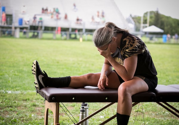 Shaw, originally from Elora, Ont., and the mother of twins, sits on the treatment table after injuring her ankle in the second half.Melissa Tait/The Globe and Mail