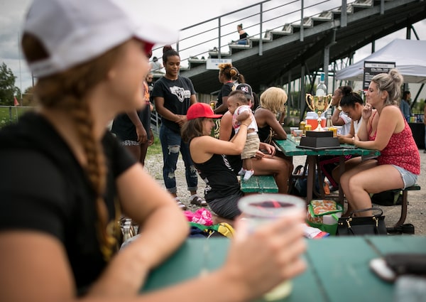 Shannon Howes, background, tapes her ankles ahead of the match, while Meaghan Sheahan catches a rugby ball from Howes's daughter. The Guardian Angels club was founded in 2018 to give women who have retired from competitive rugby a chance to get back into the sport. All have played high-level club or university rugby, but left the sport as they started careers and families. Players commit to one game on Saturdays and no training sessions.Melissa Tait/The Globe and Mail