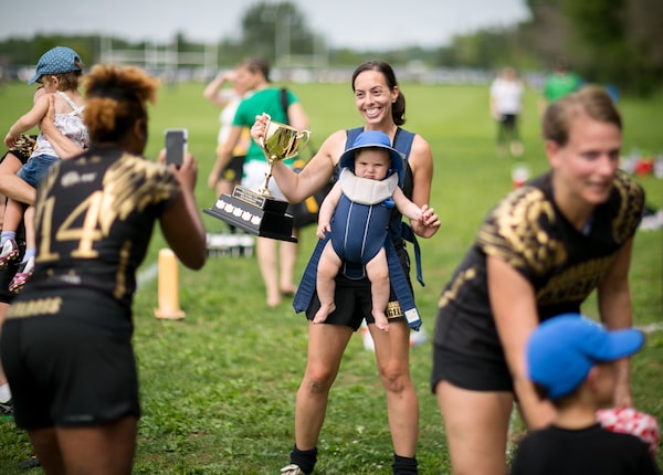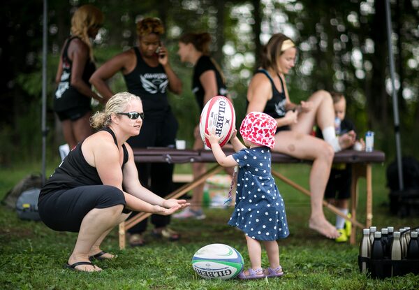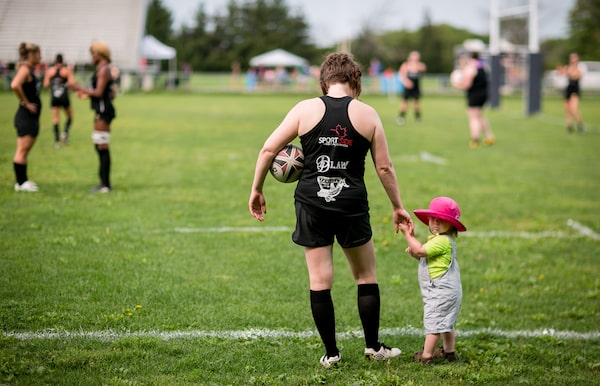 Aug. 18, 2018: Jill McCallum, a player with the Guardian Angels women's rugby club, brings along her daughter, Eleanor, to warm-up before a championship game on Fletcher's Fields in Markham, Ont. The team, part of the Ontario Women's League (Rugby Ontario) in the second division, has a babysitter on the sidelines to help players who don't have partners at the game to watch the kids.Melissa Tait/The Globe and Mail