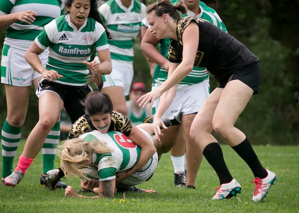 Back on the field, Sibbett, also known as Moose, is tackled during the second half. Tackling in rugby has only a few limitations: The timing matters (early or late) and contact must be below the shoulders. But not every moment is caught by the referees during an aggressive play.Melissa Tait/The Globe and Mail