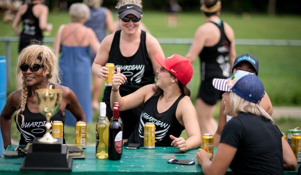 The Guardian Angels celebrate with drinks at the Fletcher's Fields beer tent, while the bronze medal OWL 1 game plays on in the background. Traditionally, the teams choose a player of the match from the opposing team who has to chug a beer to celebrate.Melissa Tait/The Globe and Mail