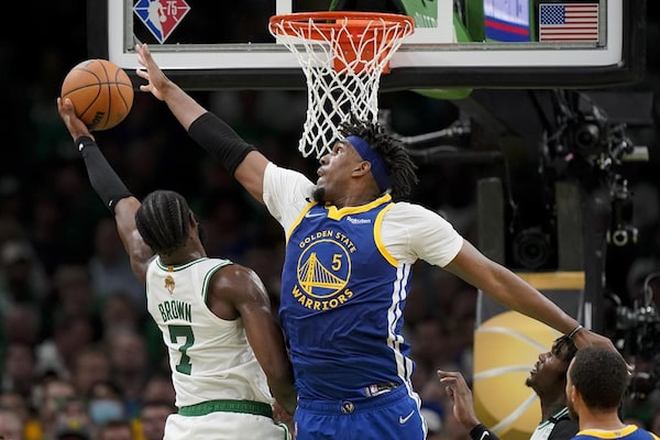 Boston Celtics guard Jaylen Brown puts up a shot against Golden State Warriors center Kevon Looney during the fourth quarter of Game 6 of the NBA Finals on June 16 in Boston.The Canadian Press