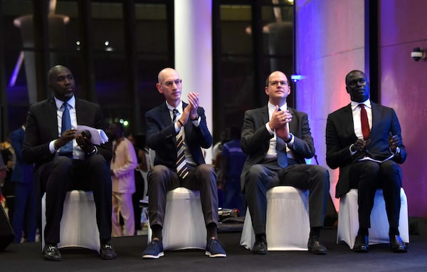 From left to right; Senegalese presidential advisor for sports Ndongo Ndiaye, NBA commissioner Adam Silver, secretary general of the International Basketball Federation Andreas Zagklis and the president of the Basketball Africa League Amadou Gallo Fall at the announcement of the the NBA-backed Basketball Africa League in Dakar, Senegal, in July, 2019.SEYLLOU/AFP/Getty Images