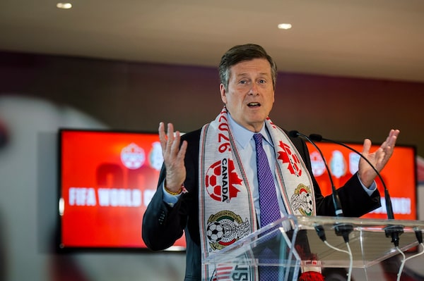 Toronto Mayor John Tory discusses the successful joint North American bid by Canada, the United States and Mexico to host the 2026 World Cup at a news conference in Toronto on Wednesday, June 13, 2018.Christopher Katsarov/The Canadian Press