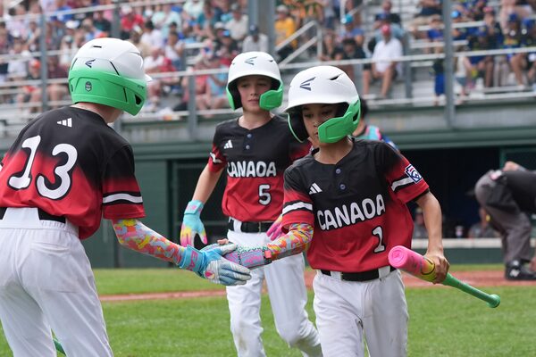 Canada's Davis Weibel celebrates a run with teammate Emmett Stefanson during the second inning of a baseball game at the Little League World Series against Australia, Sunday, Aug. 17, 2025, in South Williamsport, Pa.Caleb Craig/The Associated Press