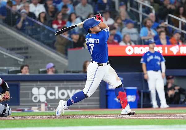 Toronto Blue Jays third baseman Kazuma Okamoto hits a home run against the Cleveland Guardians during the fourth inning at Rogers Centre.Nick Turchiaro/Reuters