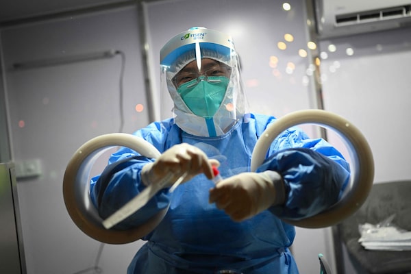 An employee collects a COVID-19 test swab from a member of the media in Beijing.FABRICE COFFRINI/AFP via Getty Images