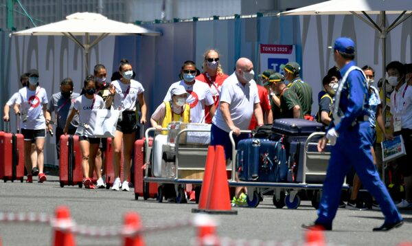 Canada's team arrives at the Olympic Village for the Tokyo 2020 Olympics on July 18, 2021.190913+0900/The Associated Press